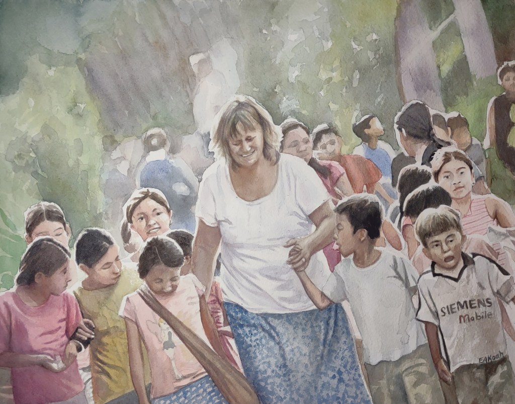 Gale Hull (center) was the President and founder of Partners in Development (PID). She was a friend and mentor to me and an inspiration to all who have had the privilege of knowing her. She passed away tragically in 2021. Prints of this painting in her memory are for sale and all proceeds will benefit PID. For more information about PID, please visit http://www.pidonline.org.